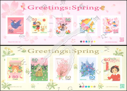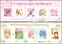春季问候,绘画《春风》及《樱花》等2枚不干胶自贴小版张(共10票)