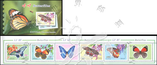 蝴蝶,珠凤蝶、三色蛱蝶、斑凤蝶及红锯蝴蝶小本票(4票,带2枚附票为蝴蝶)