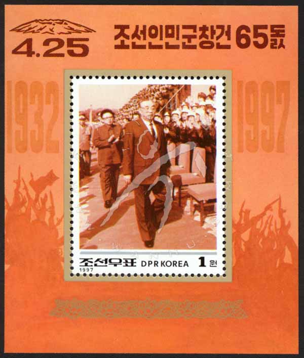 朝鲜人民军建军65周年,金日成与金正日视察军队小型张