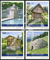 爱国基金会系列—小建筑,埃克伯格庭院的狮子喷泉、梅伽叶的小仓库、瓦登斯维勒的夏季小凉亭及皮斯基亚沃瑞士的古老粮仓附捐票4全