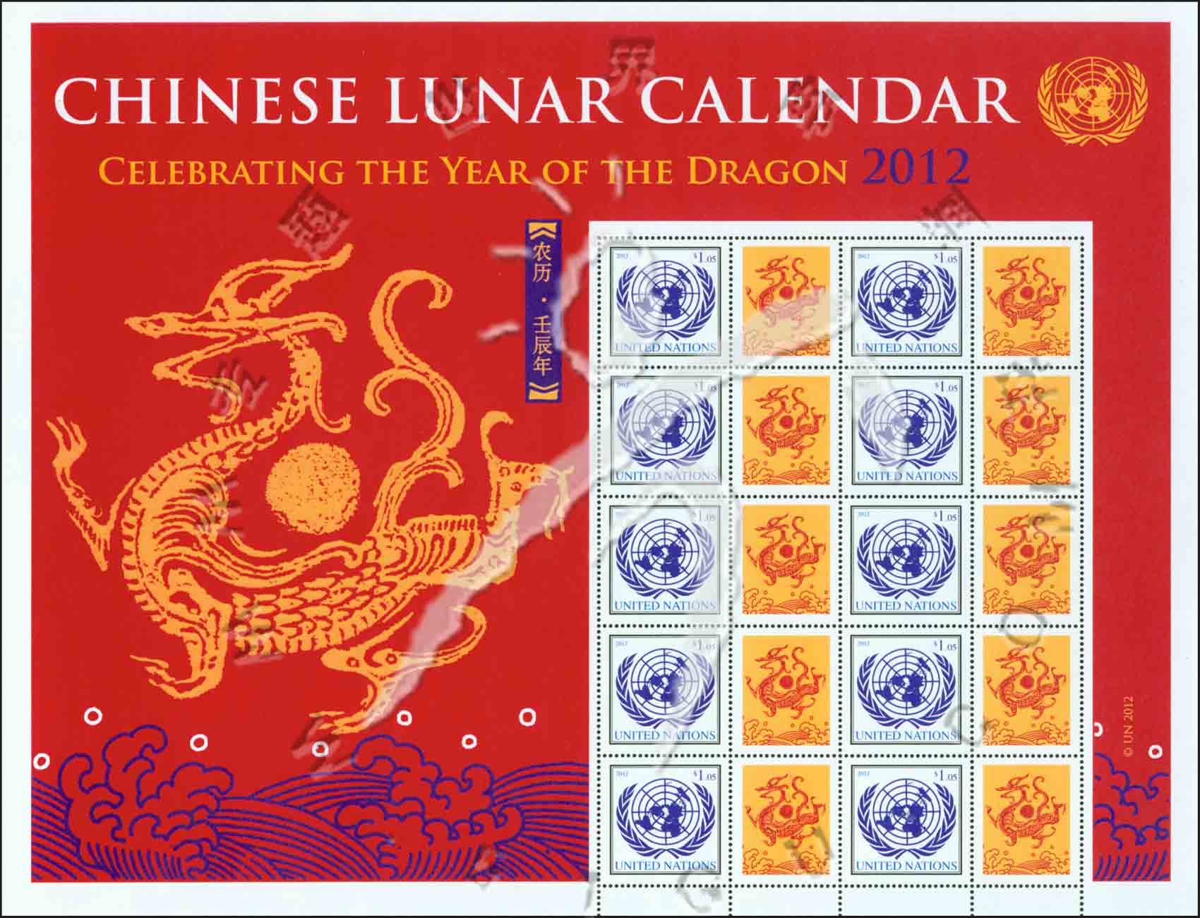 龙年生肖个性化邮票,联合国徽志小版张(10票带10枚附票为绘画水龙)