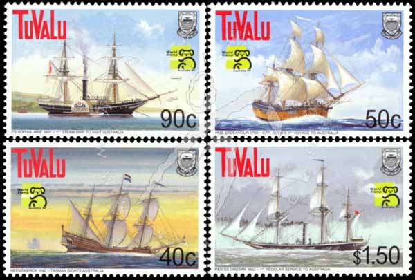 澳大利亚世界邮展,海姆斯克尔克帆船、奋进号帆船及蒸汽船(库克船长首次航行至澳大利亚的帆船)及加盖邮展徽志4全