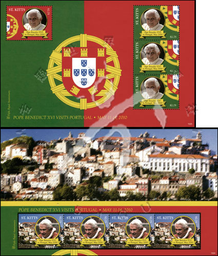 罗马教皇本笃十六世出访葡萄牙,肖像及城市建筑等2枚小版张(各4票)