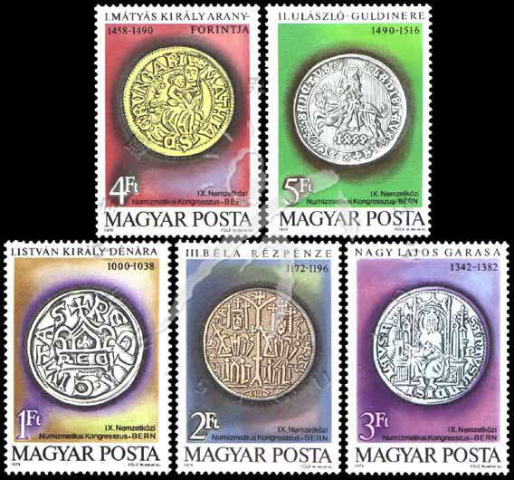瑞士伯尔尼第9届国际钱币学会议,斯蒂芬一世时期“第纳尔”、贝拉三世时期铜币、路易国王时期格罗申小银币、马提亚斯一世时期金币等5全
