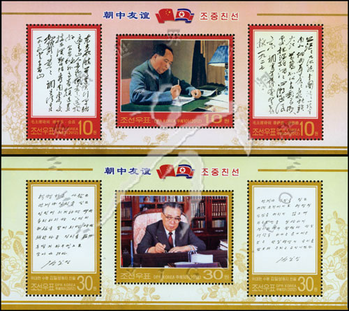 朝中友谊,金日成肖像、金日成回忆录《与世纪同行》、毛泽东肖像及毛主席诗词2枚小全张(各3票)(我社已售缺)