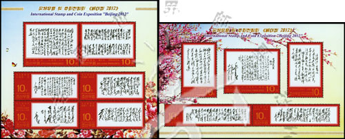 北京国际邮票钱币博览会,毛主席诗词2枚小全张(其中1枚含5票,另1枚含6票)(我社已售缺)