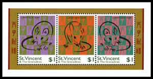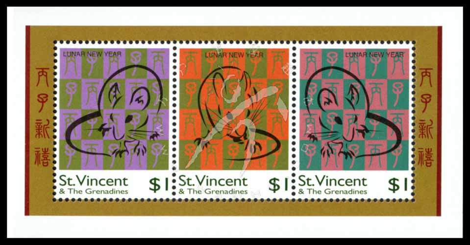 鼠年生肖,鼠简笔画及中文书法小全张(3票)