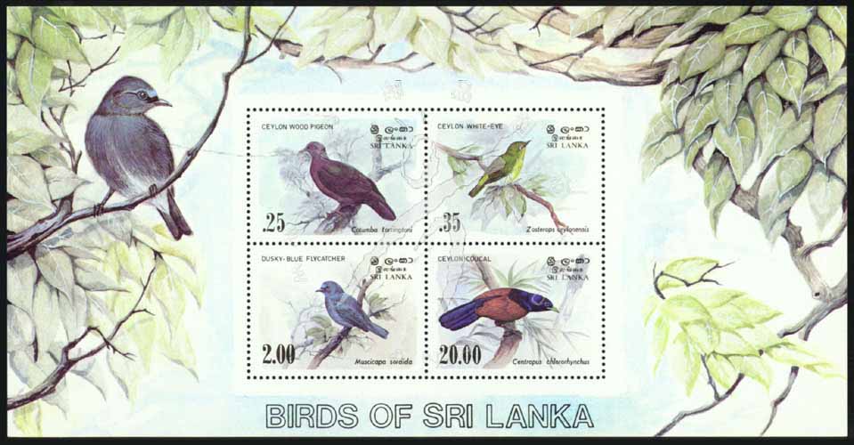 鸟类,斑尾林鸽、斯里绣眼鸟、斯里暗蓝翁及褐翅鸦鹃小全张(4票)
