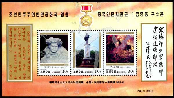 中国人民志愿军英雄邱少云,塑像、牺牲场景及江泽民题词小全张(3票+2枚附票)