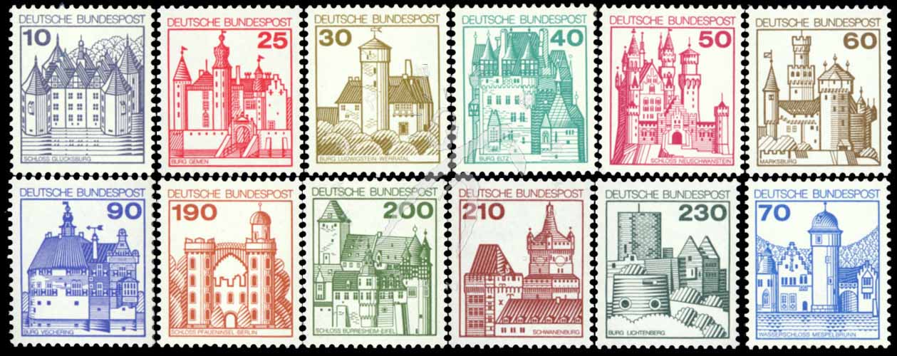 城堡和宫殿普票,格吕克堡(快乐宫)宫殿、波科特城盖门城堡、路易斯坦堡、埃尔茨城堡、诺伊施万施泰因宫、马尔克斯堡及利契顿城堡等12枚