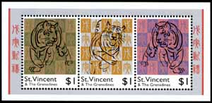 虎年生肖,虎简笔画及中文书法小全张(3票)