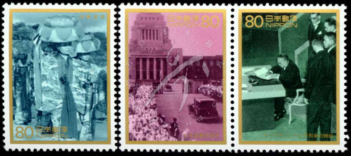 日本战后50周年,天皇轿车驶抵国会大厦和围观人群、日美《旧金山和约》签字仪式及传统冲绳舞蹈表演等3全
