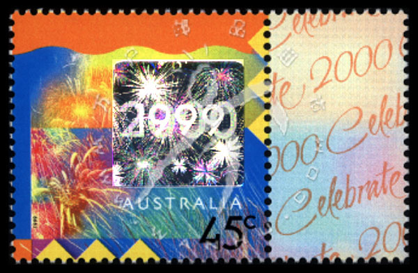 澳大利亚迎接2000年,烟花等激光镭射全息图(图中1999与2000字样在不同角度下交替出现)邮票1全