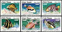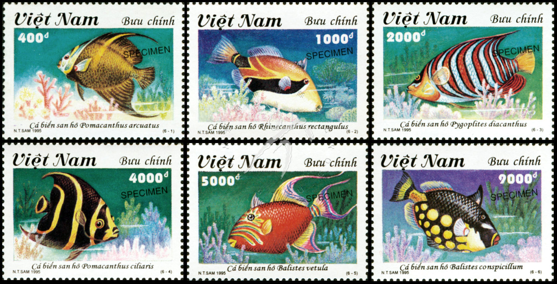 鱼类,灰神仙、斜带吻棘鲀、皇帝神仙、皇后神仙、女王炮弹及花斑拟鳞鲀样票6全