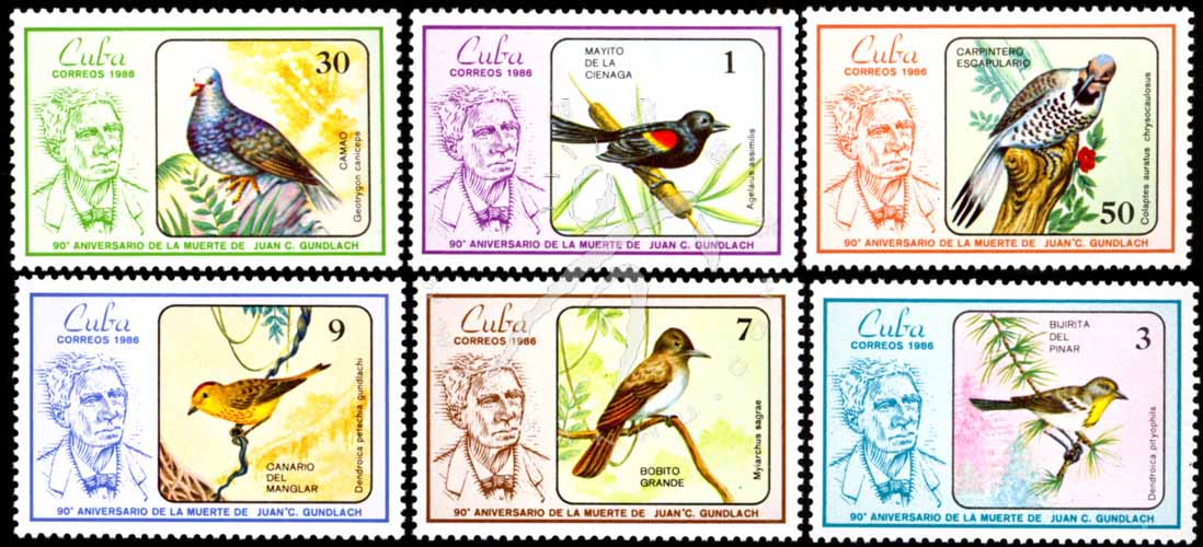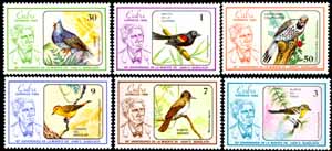 鸟类学者胡安·孔德拉齐逝世90周年,肖像及鸟类红肩黑鹂、橄榄顶林莺、拉色氏霸鹟、黄色林莺、灰头鹑鸠及朴动鴷6全
