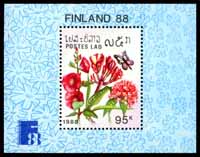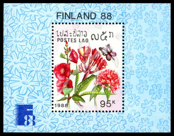 芬兰世界邮展—花卉与蝴蝶,徽志、鸡蛋花、蜀葵、红龙船花及蝴蝶小型张