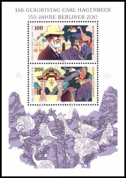 动物学家卡尔·哈根贝克(1844-1913)诞生150周年及柏林动物园创建150周年,肖像、动物及动物园入口小全张(2票)