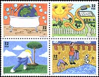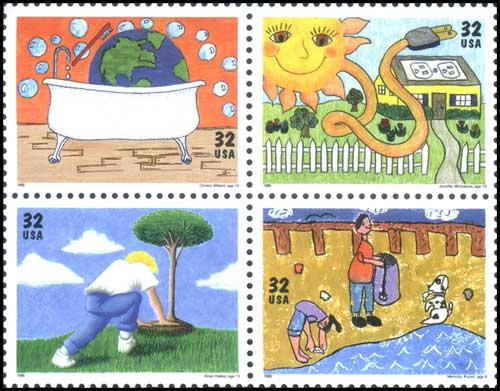 地球环境日,儿童画《节约饮用水》、《利用太阳能》、《种树》及《在湖滩上播种》4联