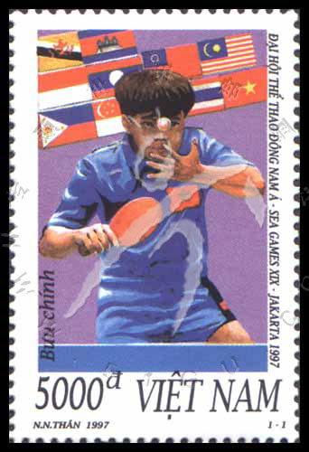 第19届东南亚运动会,乒乓球运动员比赛场景及参赛国国旗1全