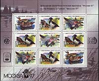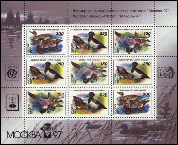 野鸭,赤颈鸭、凤头潜鸭及花脸鸭加盖97莫斯科世界邮展小版张(9票)