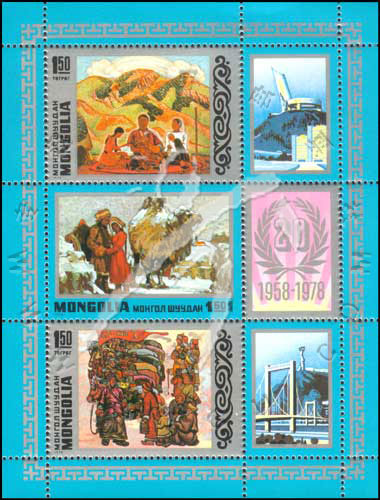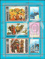 蒙古与匈牙利印刷邮票合作20周年,蒙古画家阿穆古朗绘画《草原的主人》、《冬日夜晚》及《铜制马蹬》小全张(3票+3枚附票)