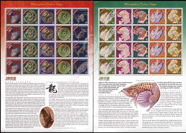 龙年生肖,中国古物上的龙绘画、龙形古物、古玉、古玩、金龙鱼等2枚小版张(4套共40票,附有马来西亚及英文有关龙和鲤鱼传说的说明)