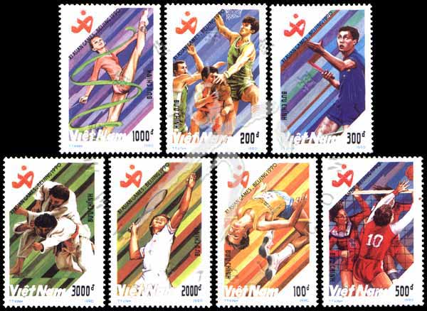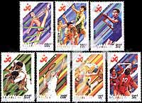 北京第11届亚运会,会徽、跳高、篮球、乒乓球、女子排球、艺术体操、网球及摔跤7全