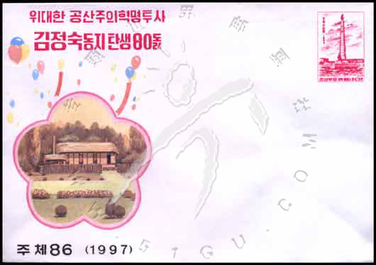 金日成夫人金贞淑诞生80周年,出生地会宁及主体思想塔邮资封1枚