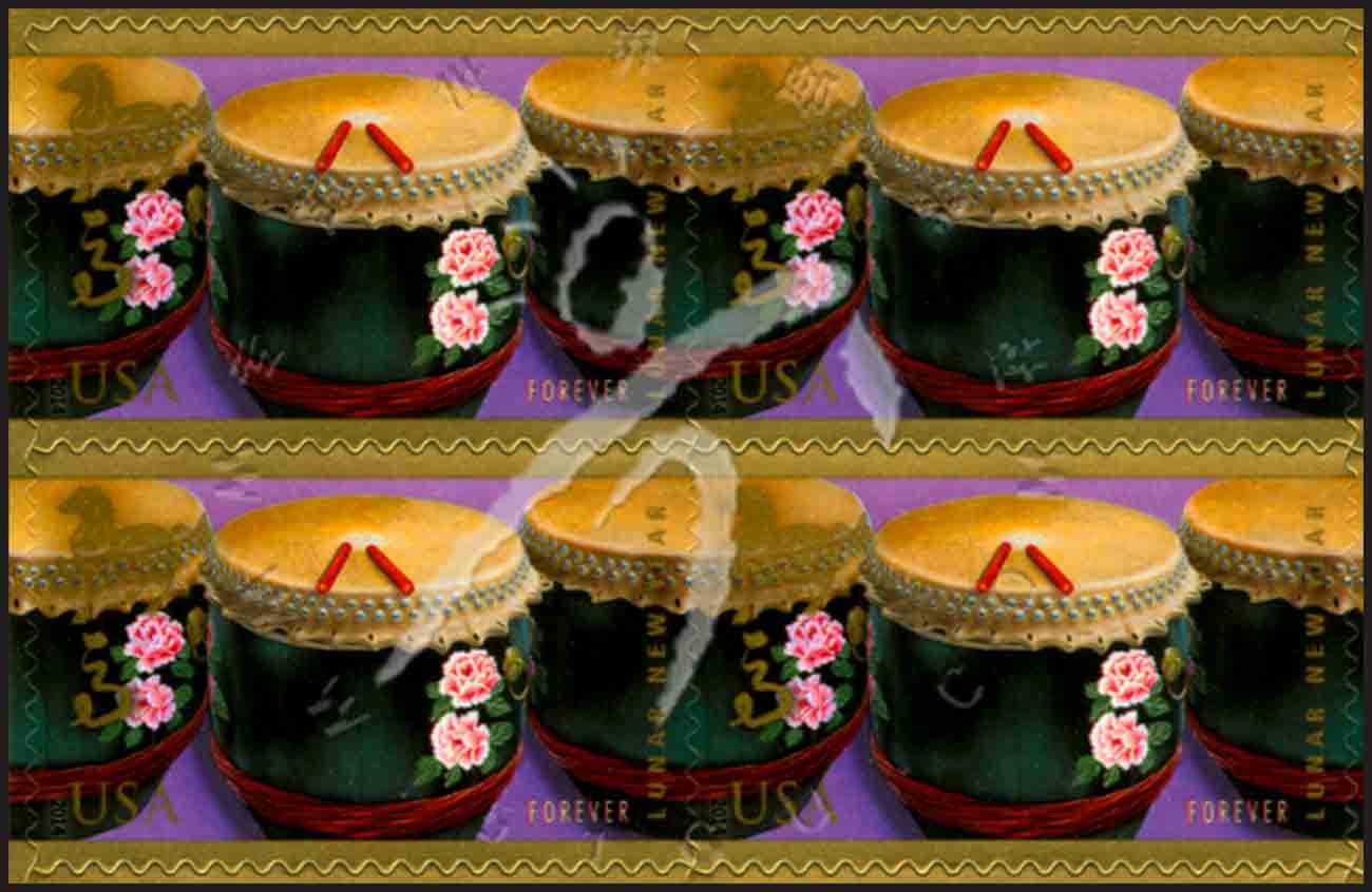 马年生肖,鼓及汉字马不干胶自贴票4方联