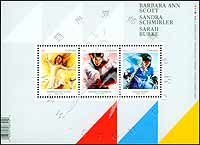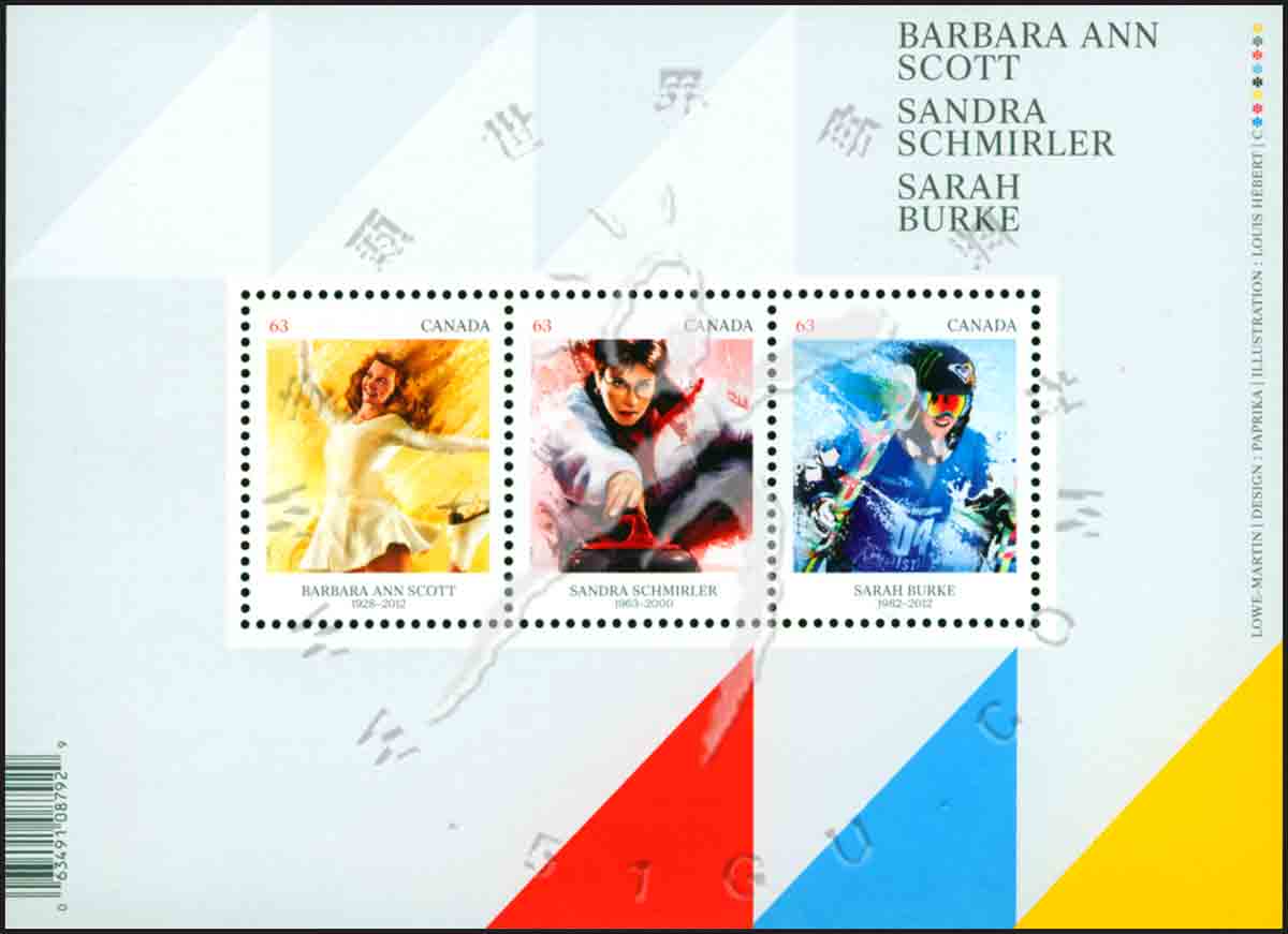 加拿大女性体育明星,花样滑冰运动员芭芭拉·斯科特、女子冰壶运动员桑德拉·舒米勒及自由式滑雪运动员萨拉·伯克小全张(3票)