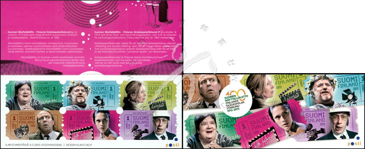 芬兰演员协会百年,电视演员Ritva Valkama、电影演员艾斯科·萨米恩、欧提·马纳帕及喜剧演员Aku Hirviniemi不干胶自贴小本票(6票)