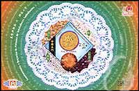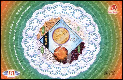 美食与甜品二—街边小食,杏仁饼(杏仁、西米、红豆、米)2002北京邮票钱币展加盖小型张(采用法国以柯式平版加热熔技术印刷,效果逼真)