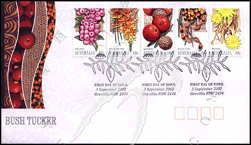 原住民食物,史密斯氏番樱桃(食果)、银桦树(食花)、澳大利亚檀香果(食果)、相思果(食种子)及孟农(食块茎)5全邮票首日封