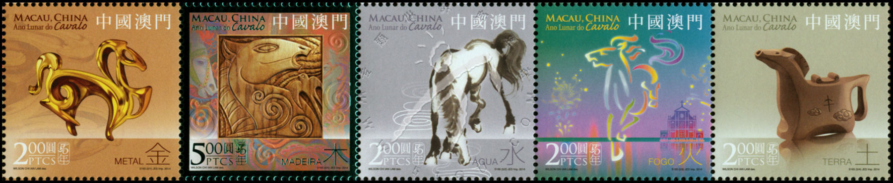 马年生肖,金、木、水、火、土元素的马形图案5联