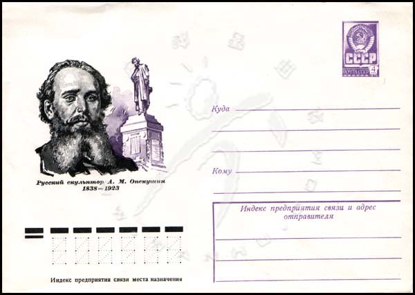 俄雕塑大师奥轮库申(1838-1923)诞生140周年,肖像及其塑像邮资封1全