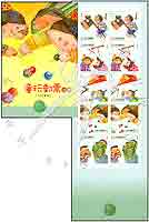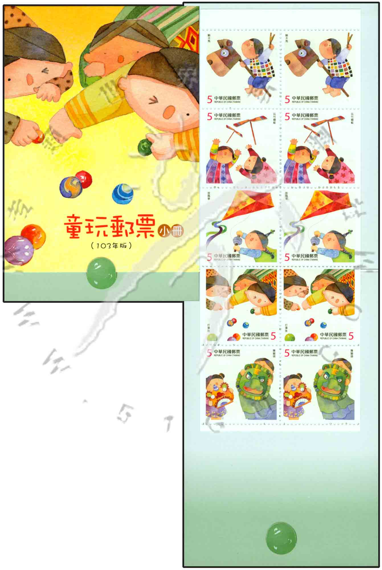 童玩邮票,骑木马、玩竹蜻蜓、放风筝、打弹珠及舞狮头小本票(2套共10票)