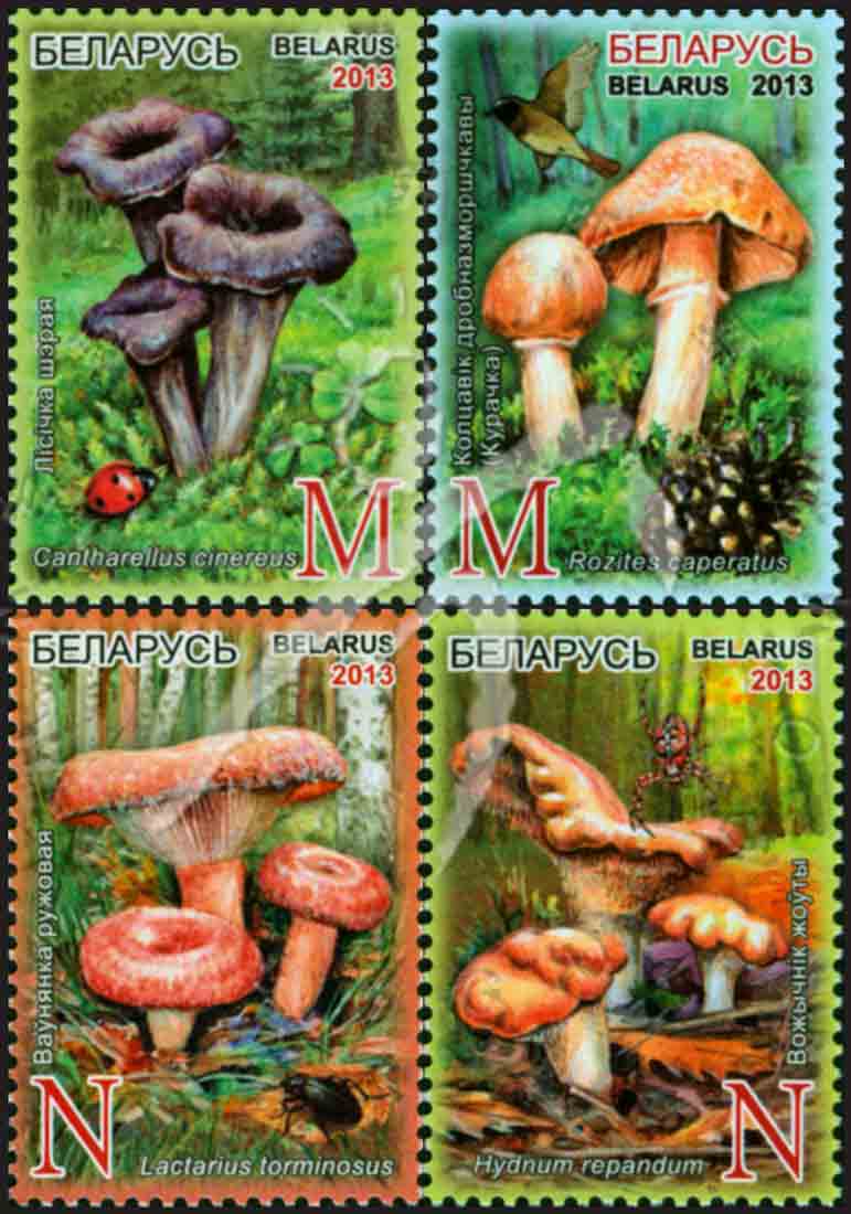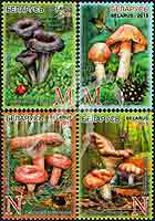 邮票介绍:蘑菇,白卷缘齿菌、绒毛乳菇、灰褐鸡油菌及皱盖丝膜菌4全
