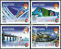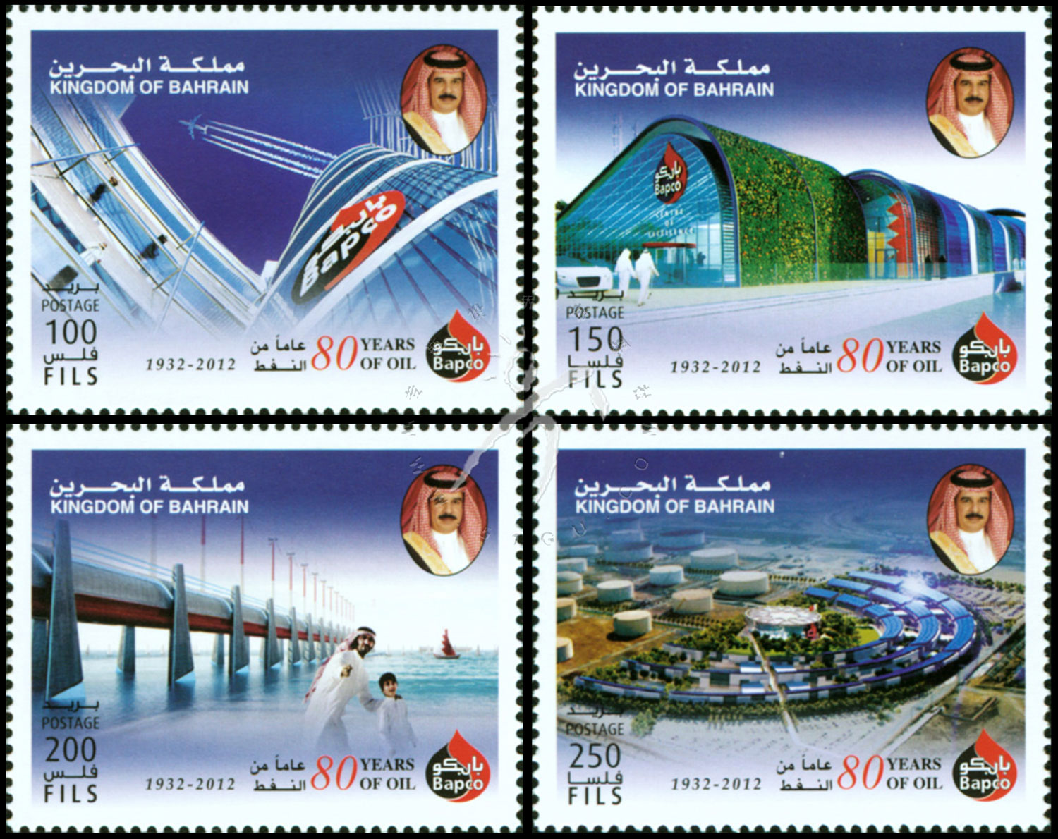 巴林发现并开采石油80周年,哈里发亲王头像、现代化建筑及石油开采基地等4全