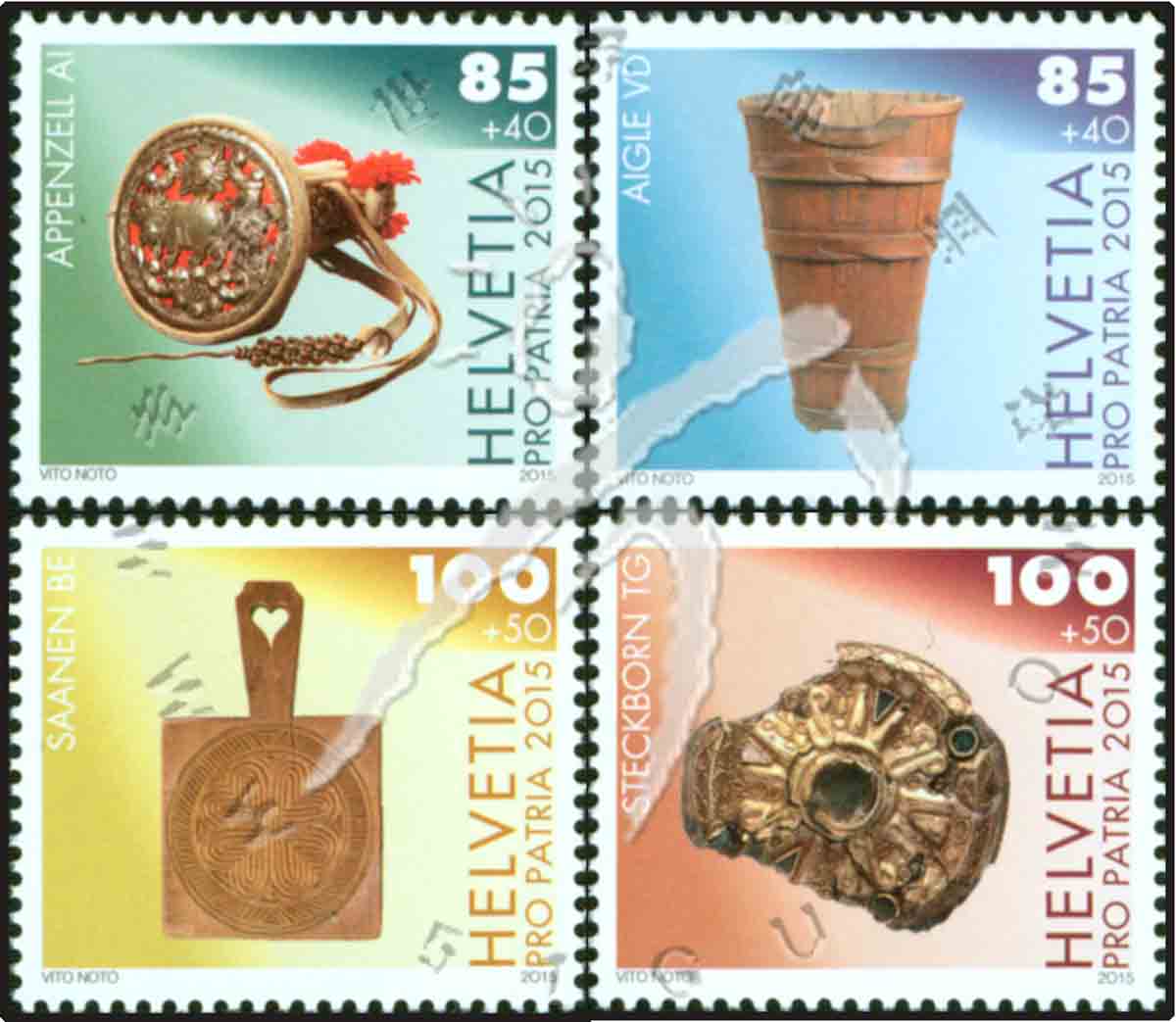 爱国系列附捐票—乡村博物馆,收获葡萄用的大木桶、烟叶袋、玻璃盘及奶酪模子4全