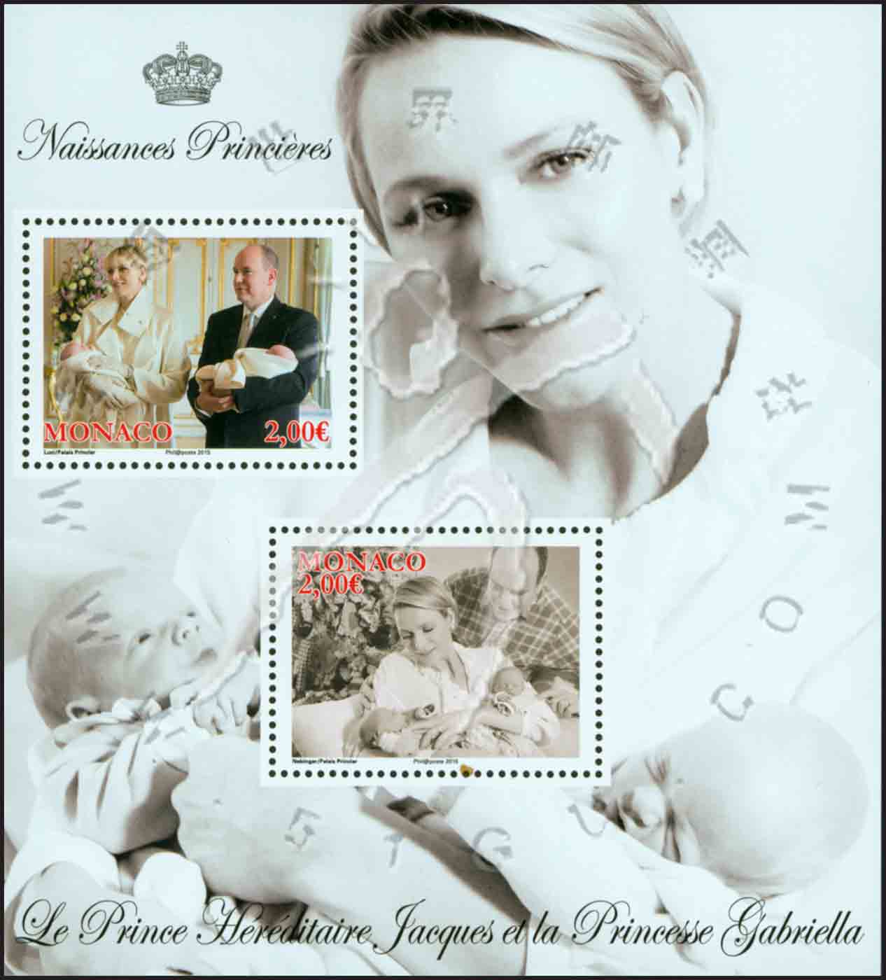 摩纳哥双胞胎皇室降生,亲王阿尔贝、王妃夏琳怀抱小公主、小王子全家福照小全张(2票)