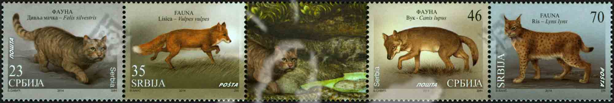 动物,灰狼、斑猫、猞猁及火狐带过桥票4联