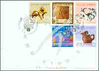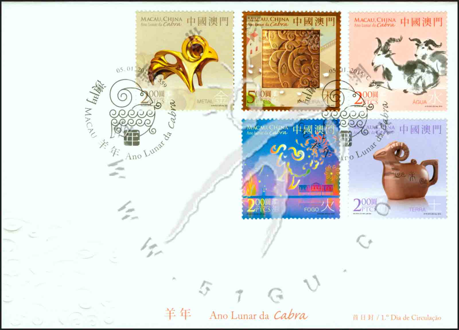 羊年生肖,金、木、水、火、土元素的羊形图案5全邮票首日封