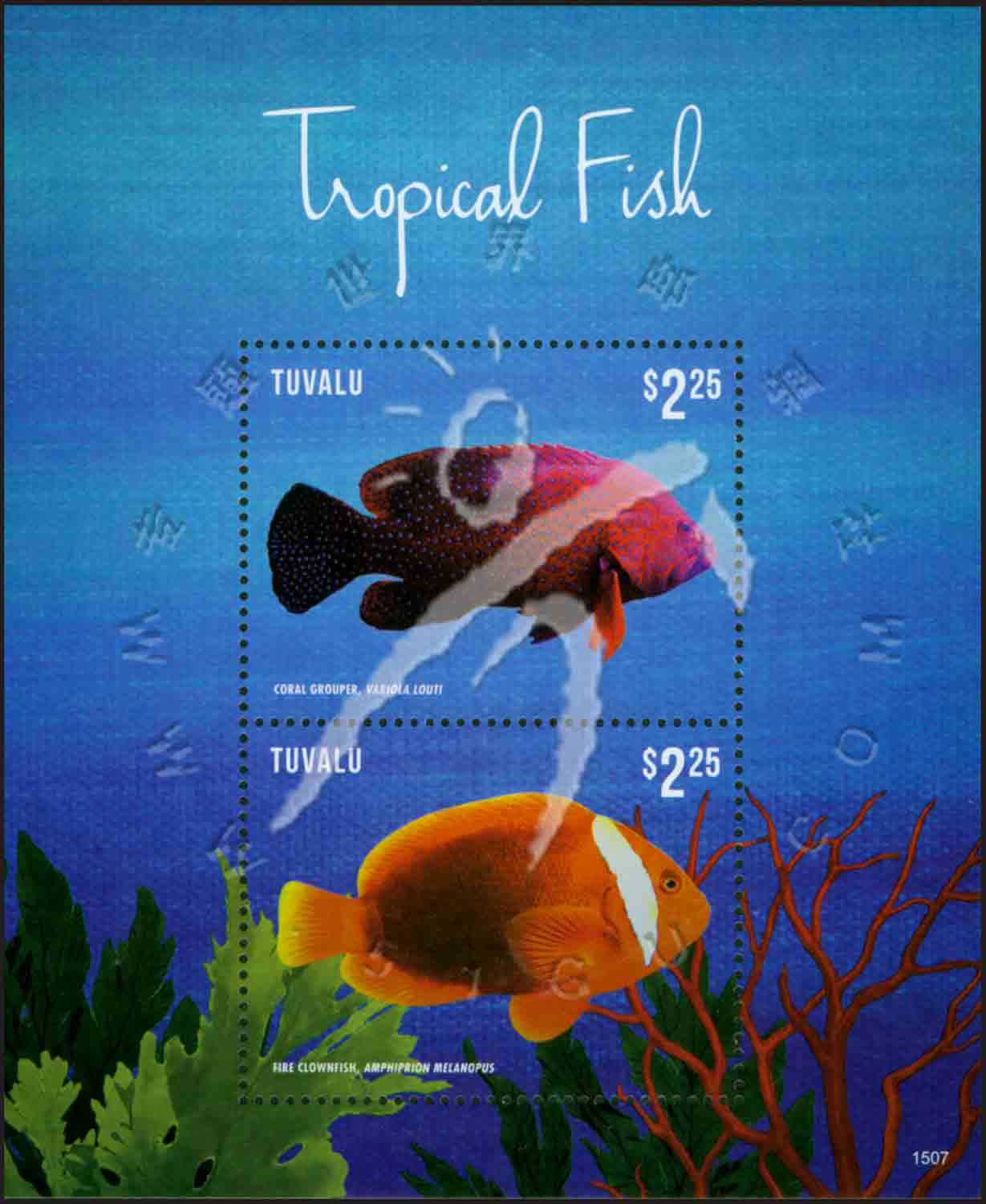 热带鱼系列一,棕斑石斑鱼及小丑鱼小全张(2票)