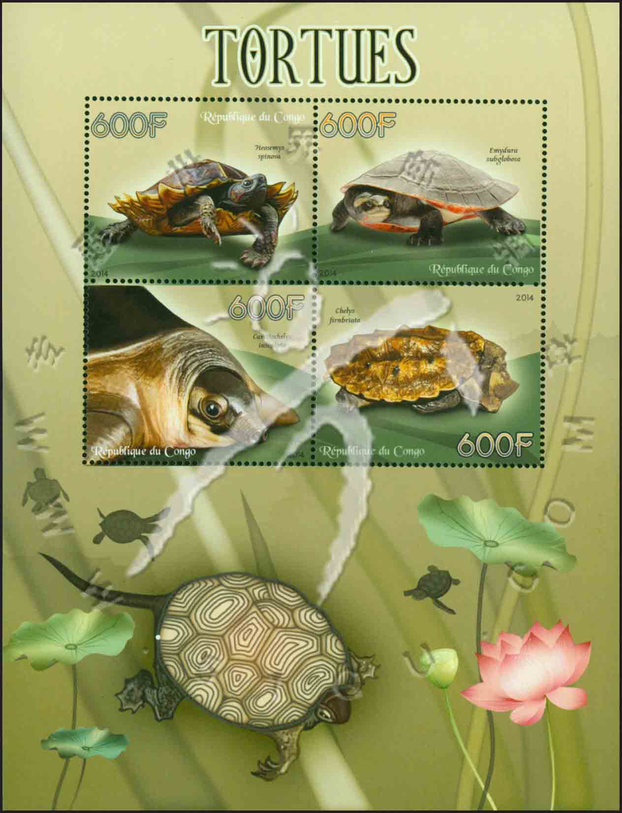 爬行动物—龟,刺山龟、红腹短颈龟、猪鼻龟及棱背龟小版张(4票)