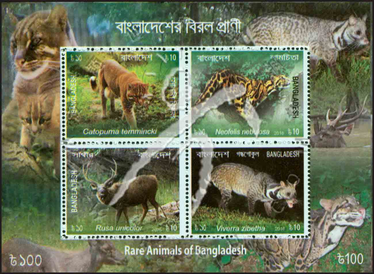 孟加拉珍稀动物,金猫、云豹、水鹿及大灵猫小全张(4票)