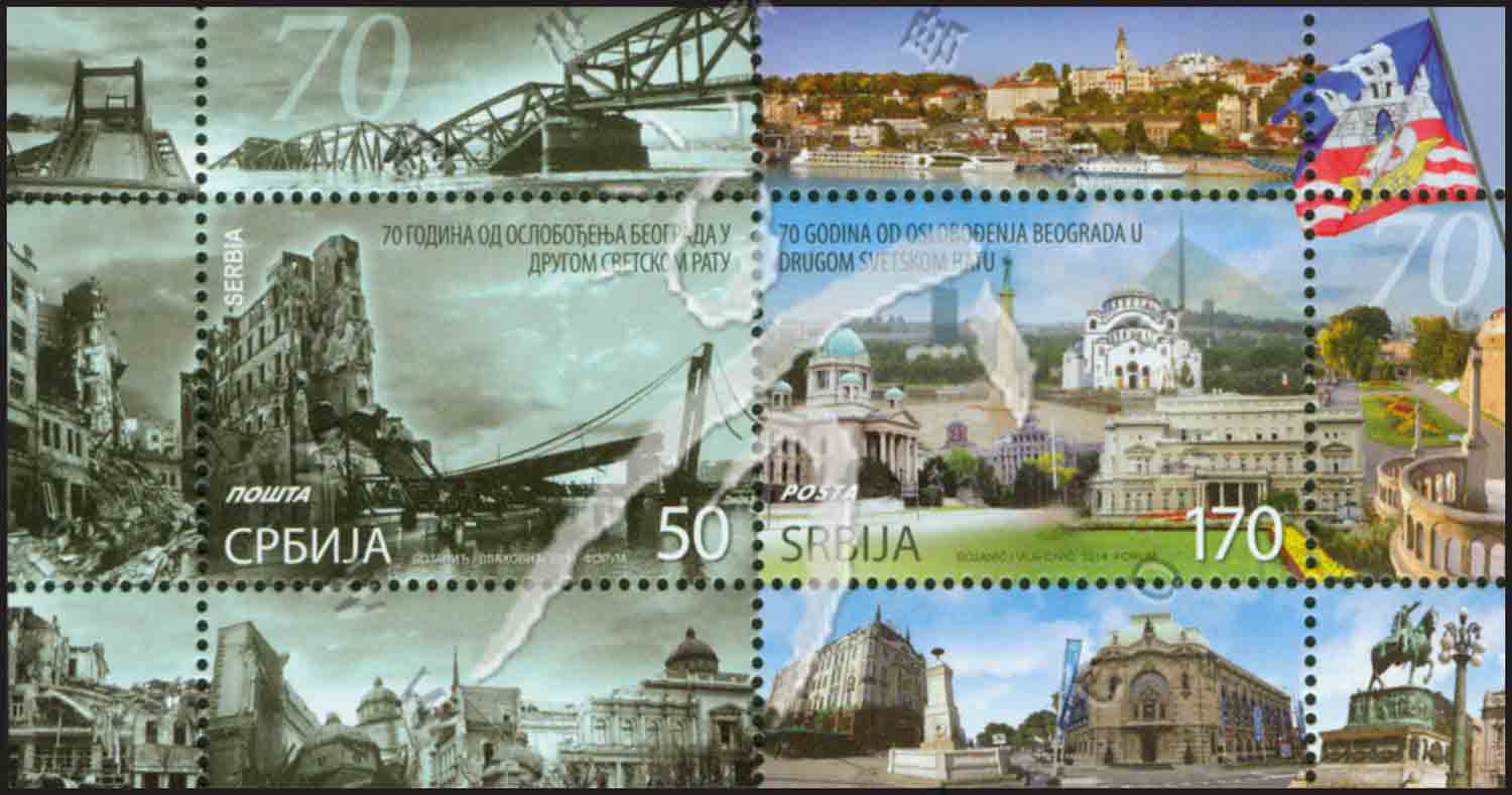 贝尔格莱德解放70周年,二战中及现在的贝尔格莱德城市小全张(2票)
