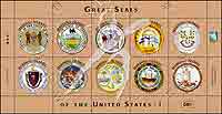 美国50州州徽系列一,特拉华州、宾夕法尼亚州、新泽西州、乔治亚州、康涅狄格州、马萨诸塞州、马里兰州及南卡罗来纳州等小版张(10票)
