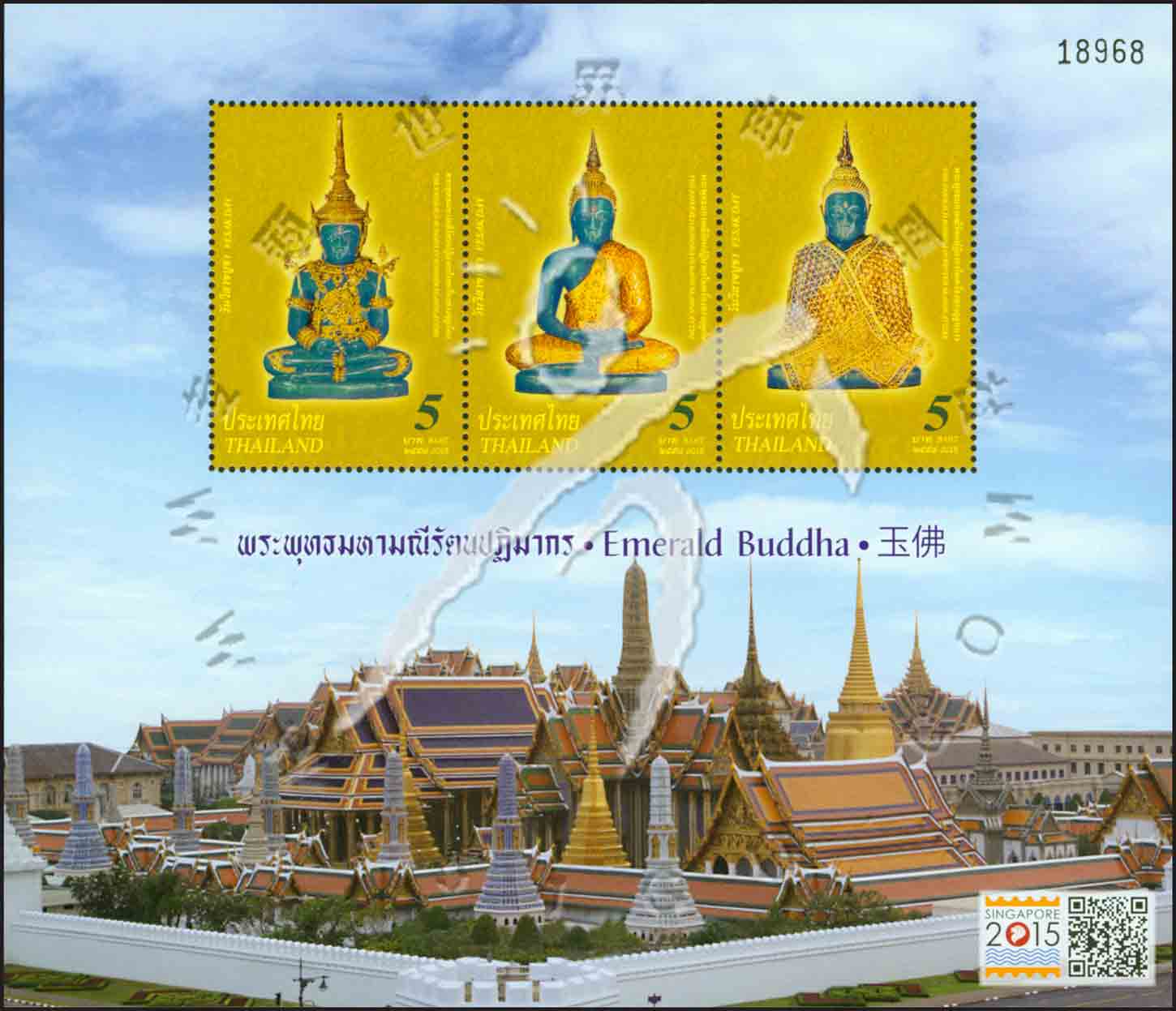 新加坡2015年邮展—泰国卫塞节,着夏季、雨季及冬季服饰的翡翠佛像小全张(3票)