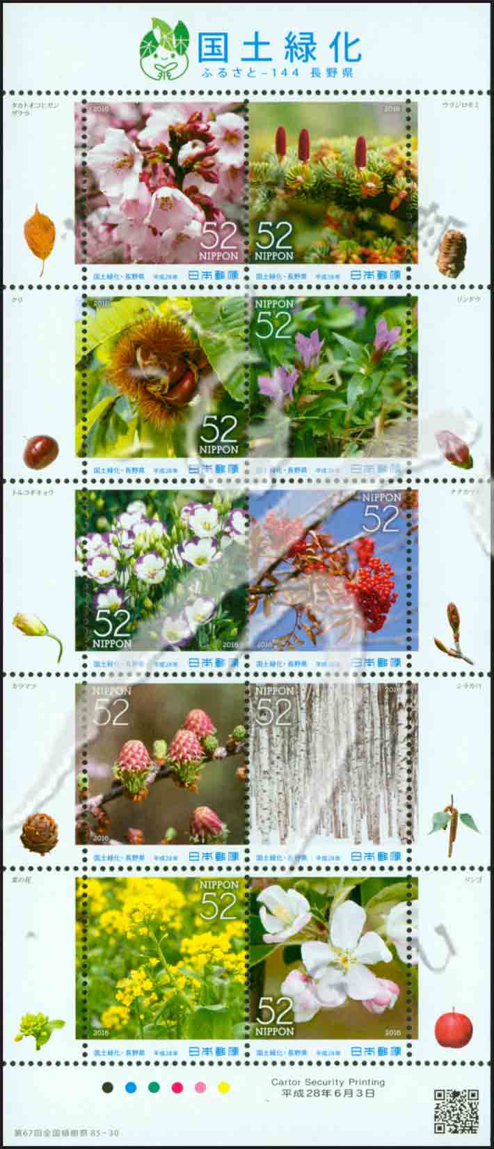 国土绿化,高远小彼岸樱花、冷杉、板栗、龙胆、洋桔梗、花楸、落叶松、日本白桦树、油菜花及苹果小版张(10票)