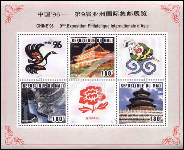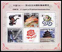 中国第9届亚洲国际邮展,天安门、长城及天坛等小全张(3票+3枚附票为邮展徽志、北京牡丹等)